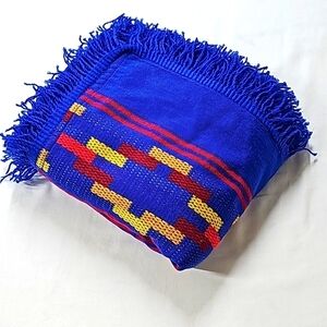 Guarda Pampas Inca poncho, red blue yellow, v-neck, fringe, feels like wool