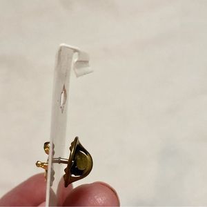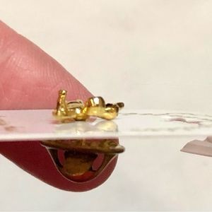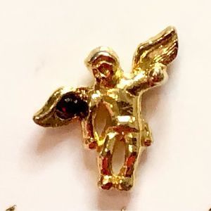 Gold tone pin has a dark red faux stone of some sort. I don’t think it’s a gem. Pin is much smaller than it looks. 12 mm X the wings span 14 mm. Back clip clasp (forgetting what it’s called) it marked Ballou Reg D which is a 1960’s company that made unique pieces such as this pin. #vintage #angel #pin