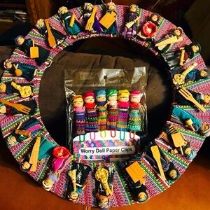 Infamous worry dolls circular hanging and package of worry doll paper clips and mini notebook