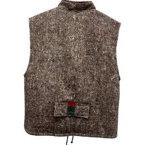 This wool tweed vest features a drawstring at the hem, a stand-up collar, a zip front, a back pocket, chest pockets with flap closures, side pockets, and lined with inside pockets. Brown tweed with brightly colored accent trim, made in Guatemala, excellent condition, size medium