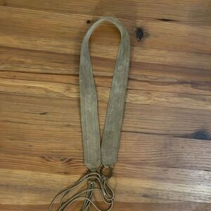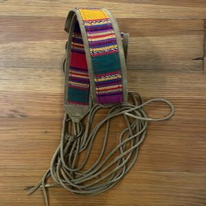 Multicolor, 100% cotton, striped pattern waist belt backed in tan, 100% suede leather with leather fringe ties in a women's size extra large. Made in Guatemala. Approximate measurements shown in photos. Adjustable so it will fit a variety of sizes. In excellent pre-owned condition with little to no signs of wear or use. latino, hispanic, casual, leather, tapestry, woven