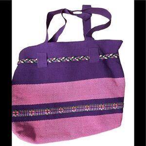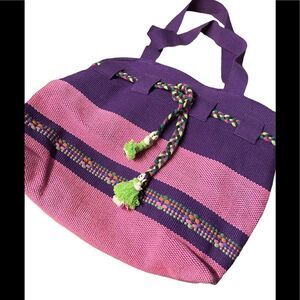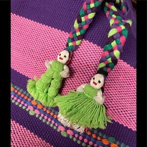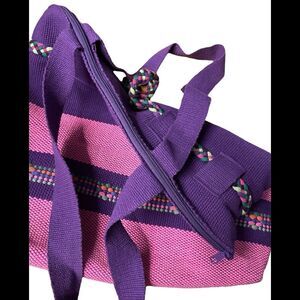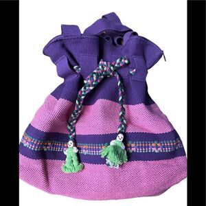 Purple and pink woven bag with a zipper closure. Braided drawstring with adorable worry dolls on the ends. Pink lining with a zipper closure.