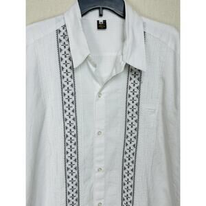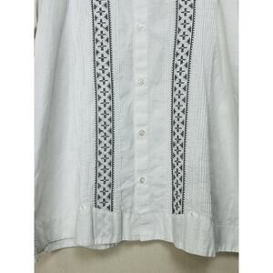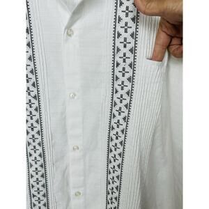 This Guayaberas Finas Cuban short sleeve shirt in white with black embroidery is a stylish and versatile addition to any man's wardrobe. Made from a breathable linen blend, it features a classic collared neckline, short sleeves, and a button-up closure for a timeless look. The pleated and embroidered accents, along with the cigar pocket detail, add a touch of sophistication. Perfect for casual or party occasions, this shirt is lightweight and easy to care for, making it suitable for all seasons. The designer brand, Yucatan Guayaberas Finas, ensures high quality and a touch of hipster flair. Made in Mexico, this shirt is a great choice for those who appreciate classic yet trendy styles.