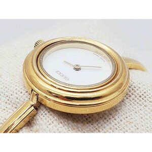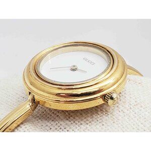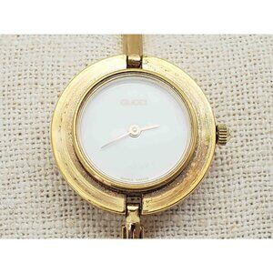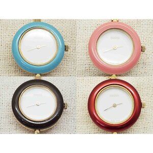 Gucci 11/12.2 gold tone wristwatch with four alternate colorful interchangeable bezels.