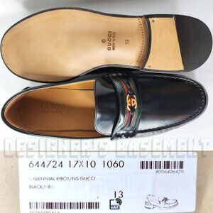 Gucci 13 black KAVEH polished Leather DOUBLE G WEB detail Loafer Shoes NIB