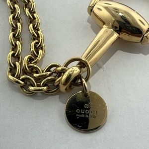 Authentic Gucci 18kt Yellow Gold Horse-bit Necklace. Made in Italy, this Necklace is 25 Inches Long including the pendant. The Rolo Link necklace is secured with a Rotating Lobster Clasp which helps keep the necklace in position when worn. The total weigh on this piece including the pendant is 28.6 grams. This pice comes with the original Gucci box and box sleeve. Rarely worn, this piece is in excellent condition with minor signs of wear. Simple elegant design that can be worn dressed up or casually.