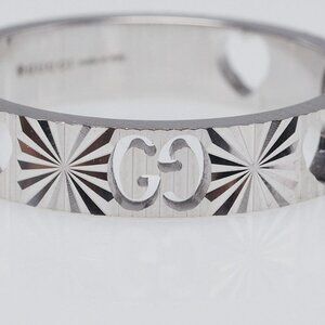 From Gucci's Icon collection, this chic ring can be worn stacked or alone. Featuring a flat band engraved with double G logo, cut out hearts in 18k white gold. A fun piece to add to your ring collection!