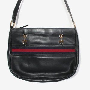 The bag is incredible and has such fabulous mod design elements! The purse is made of navy blue glossy leather with a wide, red/blue fabric stripe inlaid into the center that has gold buckle GG logo accents on both sides! It a large, zip top style, shoulder purse with a single strap that is adjustable. The purse can hold much more than you may think! This purse is designed in such a classic style!
