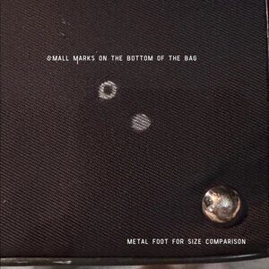The damage is limited to the bottom of the bag, consisting of two small circular spots, each approximately the size of a dime, on the nylon. See photo.