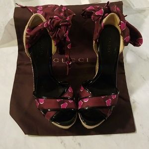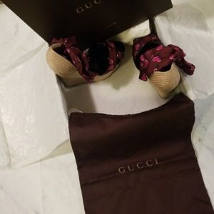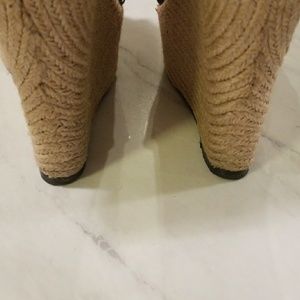 Freaking adorable wedges! They tie around the ankles with hearts! Bought from Tradsey for $300 and never got to wear them, sad face! Moving and these beauties need a new home! You can wear these with any outfit! I was going to wear them with bibs and a nice white shirt! One discolored spot that looks like a stain but is not on the right outer edge of right shoe. Picture 5 is of the bottoms. Box and dust bag included.