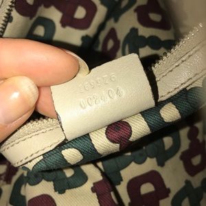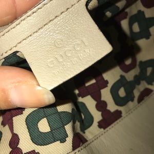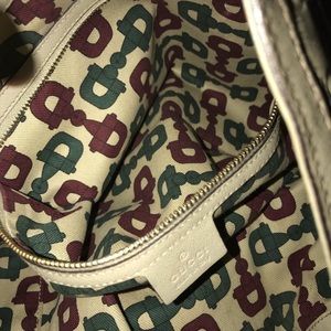 Large Gucci with a single poker in the inside for small objects. A bamboo ring hook for strap; Bamboo is Best used on inner elbow for comfort! Interior condition is smudged, no stains! No pen marks! Minor scratches on the bottom of the lining. This purse is being evaluated by a dry cleaning for maintenance of shampoo.