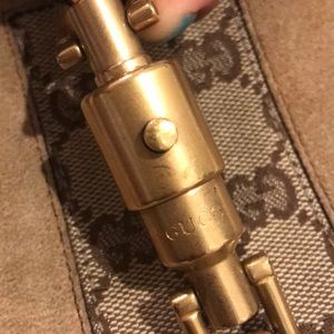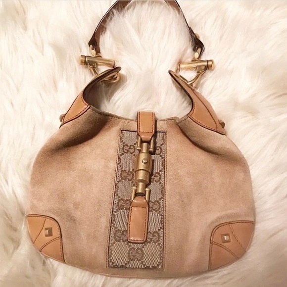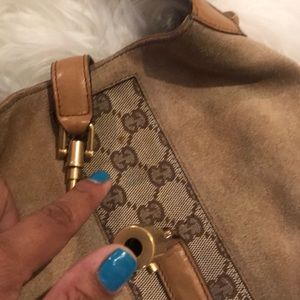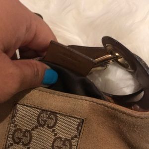 Small Gucci hand bag suede 7”x7” good condition. heavy hardware. Comes with receipt.