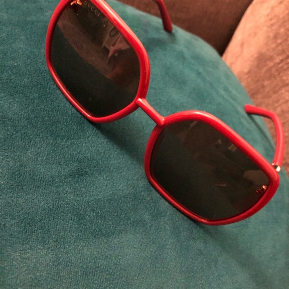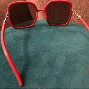 Gucci red frames square over sized with dust rag and sack in a beautiful green velvet case, brand new barely used in perfect condition
