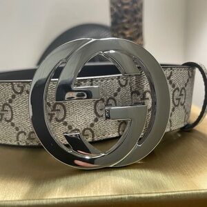 Elegant Gucci belt with signature monogram design. Features a striking silver logo buckle.