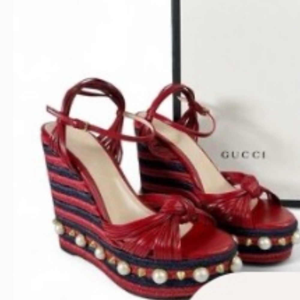 GUCCI Pearl & Spike Accent Interlocking G Barbette Espadrille Wedge Sandals