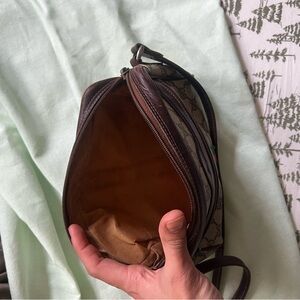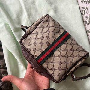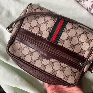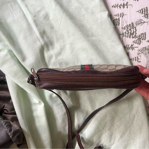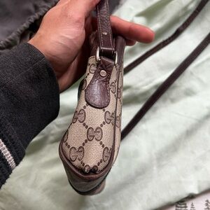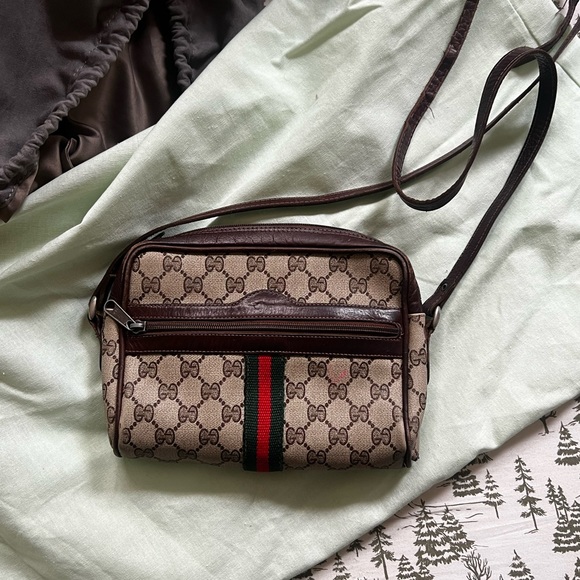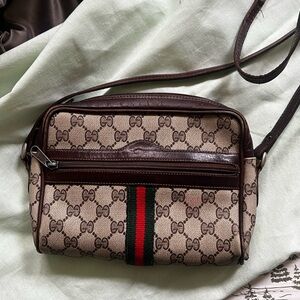 Authentic Vintage Gucci shoulder or crossbody bag with wear and tear as its over 40 years old. Still very functional usable bag has a small stain infront as pictured One corner is messed up as pictured but still usable and does no affect to the functionality