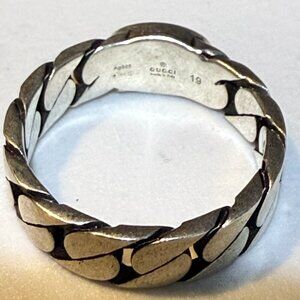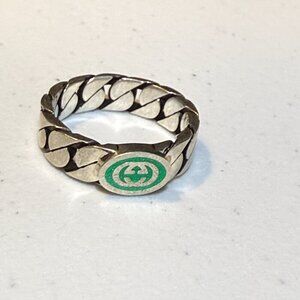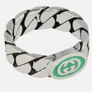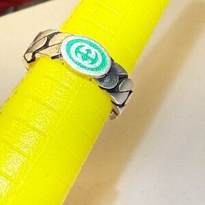 Gucci 701612 Unisex Sterling Silver Interlocking G Ring with Green plaque, SZ 19