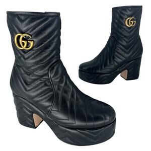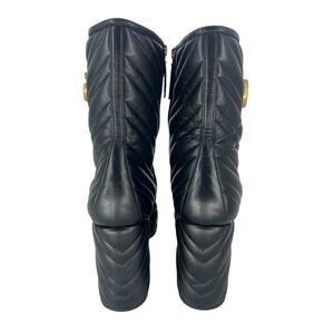 A bold and iconic Gucci statement boot crafted in luxurious black matelassé nappa leather. These high-impact Marmont platform boots feature the signature gold-tone GG logo at the shaft, a block heel silhouette, interior zip closure, and quilted chevron patterning for a sculptural, elevated look. A fashion-forward designer boot perfect for styling with denim, dresses, wide-leg trousers, and elevated streetwear. Made in Italy.