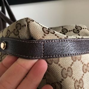 Beautiful Gucci Abbey hobo bag. Brown & tan monogram canvas with brown leather straps and trim. Gold-tone hardware. Dark brown lined interior with zippered pocket. Open top with Gucci snap strap. In excellent condition; well kept. Some slight wear on the leather handle see photo. Approx measurements: 17” length; 9.5” height ; 5” width. Priced for Authentication.