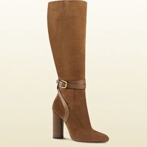 Gucci Abigail Suede Knee High Block Heeled Buckle Strappy Boots Size 36.5