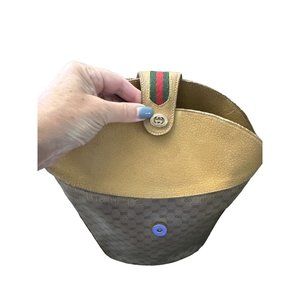 * For sale is a Gucci, RARE, brown micro Guccissima print coated canvas and leather, satchel/bucket style cross body/shoulder bag with a red and green Sherry striped, bold gold, top strap snap, gold hardware, and an iconic Gucci look! It is a rare style and color that would be great used as your signature brown purse!