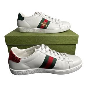Gucci Ace Bee Sneakers Size 38 White Leather Red/Green Snake Heel w/ Box, Extras