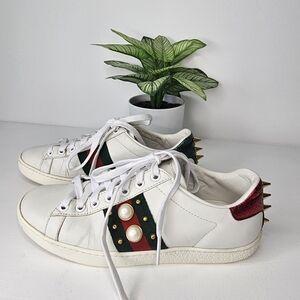 Gucci Ace Sneakers US 5 White Pearls Spikes Red Green Heel Authentic Aesthetic