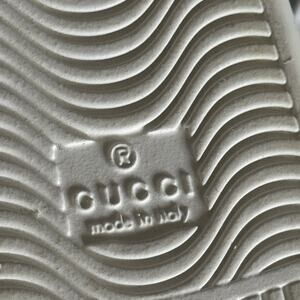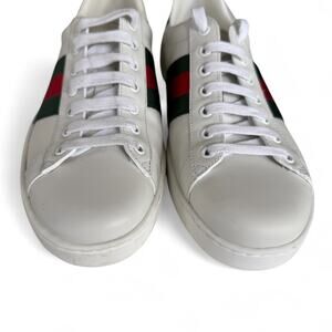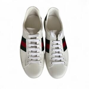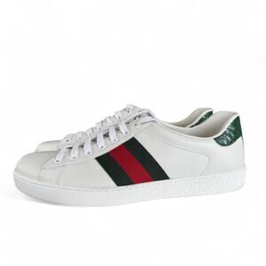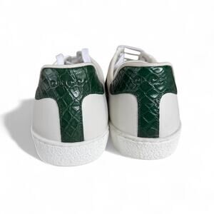 Gucci Ace Web Low-Top Sneakers in White and Green. Size Men's 7.5 = Women's 9. Features: padded tongue and collar for optimal comfort, round toe, lace up, signature Gucci striped webbing at sides, crocodile detail at heel, embossed logo at heel. Leather and crocodile upper, leather lining, rubber sole. Made in Italy. Excellent pre-owned condition, only worn once. Very small scuff on the front of right shoe (see close-up photo). Authenticity guaranteed & all photos in this listing were taken by me.