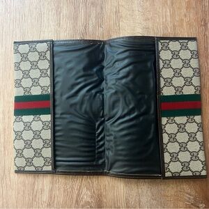 GG Supreme Monogram Canvas with web and signature woven Gucci stripe in the diary cover. Front mini pocket