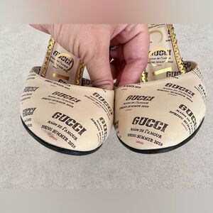 This is an authentic pair of Gucci Apollo Gucci Stamp Print Beige Leather Logo Ankle Strap Sandals
