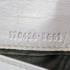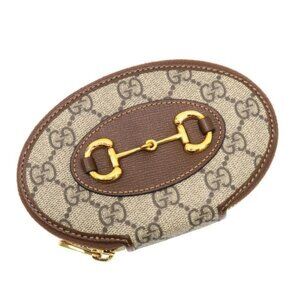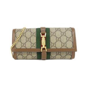 Golden brown GG canvas (appears slightly darker in photos), lavender leather trim, snap-flap closure, chain may be attached for use as purse, made in Italy