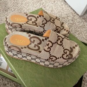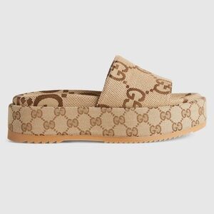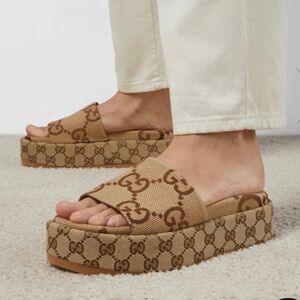 Gucci Authentic Macro GG Canvas Camel Ebony Platform Slide Sandal
