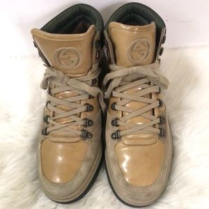 Authentic Gucci Mens Beige Leather Round Toe High Top Lace Up Sneaker Shoes Sz 9