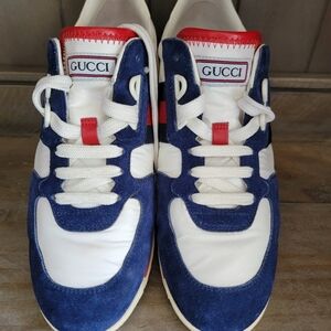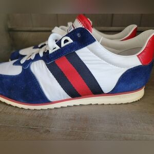 Authentic Gucci signature stripe ace suede/nylon womens sneakers in excellent pre-owned condition. Only wear is on the bottom(sole). These have been well cared for, and it shows. Extremely clean and in beautiful pre owned condition. Includes certificate of authenticity.