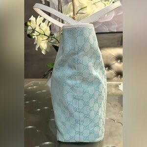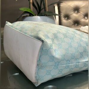 Gucci tote in baby blue with white trim. Features iconic monogram pattern on cloth fabric with leather accents. Gorgeous hardware stamped with Gucci logo. Serial number is present. Some minor corner rubs and a few faint blemishes on the fabric, the straps are excellent, the trim is in great condition, and the interior is super clean with no callouts.
