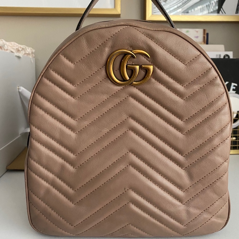 One of my favorite Gucci backpacks. Perfect for everyday use. Please review photos. Inside has pen markers and stains from use. Some scratches/pen marks throughout but still in pretty good condition. Ask any questions / pics. Flaws pictured.