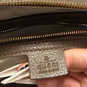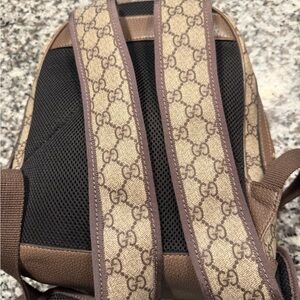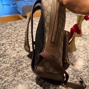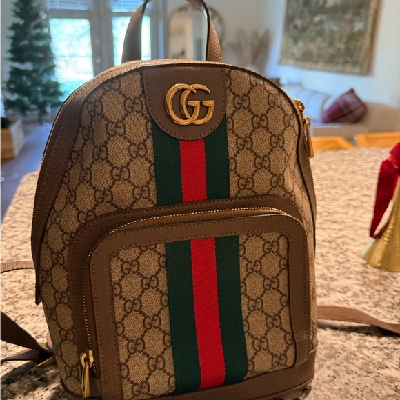 Gucci Ophedia backpack with signature monogram pattern. Features bold red and green central stripe.