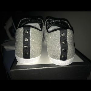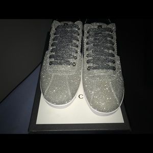 Low-top metallic textile sneakers in 'grey' silver-tone. Round toe. Lace-up closure in black and silver-tone. Black leather trim and signature tiger hardware at padded tongue. Padded collar. Signature striped webbing at sides. Black grosgrain trim and studs at heel. Black leather lining. Textured rubber sole in white. Silver-tone hardware. Tonal stitching.