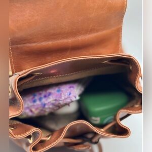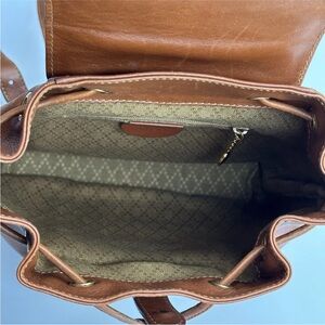Vintage Gucci leather backpack in warm cognac/brown with bamboo top handle and bamboo toggle front pocket. Classic drawstring + flap silhouette with adjustable backpack straps. Includes Gucci dust bag.