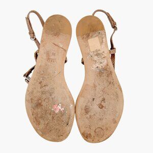These Gucci bamboo sandals in beige GG monogram canvas and brown leather bring together signature house elements in a relaxed, elegant design. The thong-style silhouette features a textured brown leather upper with a distinctive bamboo accent at the center, adding an earthy yet refined touch. A coordinating ankle strap with buckle closure offers a secure fit, while the footbed combines rich brown leather with Gucci’s iconic logo canvas for a subtle branded statement. Finished with a flat heel and leather outsole, these sandals are perfect for warm-weather wear, from vacation days to casual city strolls. Comes with a dust bag.