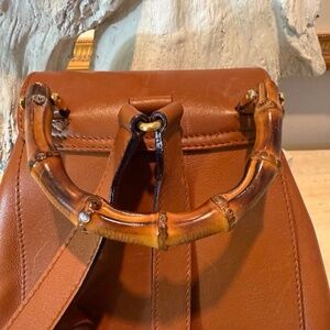 Gucci Bamboo Leather Backpack, Excellent Condition. Jacquard lining with single interior pocket. Button Close and Slide Close. Gold Tone Hardwear. This backpack is supple and classy. Purchased by me for personal use.