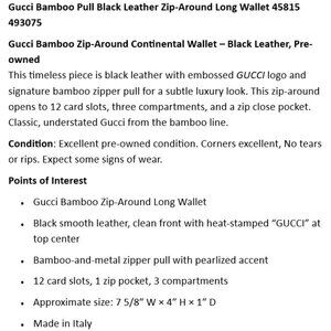 This timeless piece is black leather with embossed GUCCI logo and signature bamboo zipper pull for a subtle luxury look. This zip-around opens to 12 card slots, three compartments, and a zip close pocket. Classic, understated Gucci from the bamboo line.