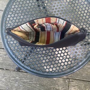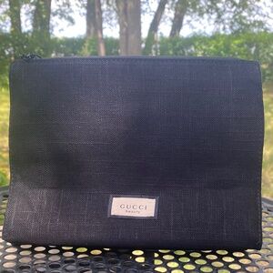 New pouch/makeup bag from Gucci Beauty. Black with top zipper close and striped inner lining with inner side pocket.