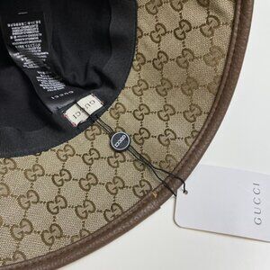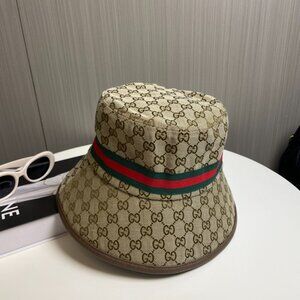 Elevate your style with this Gucci bucket hat. Featuring a classic beige design with iconic green and red stripes, this accessory adds a touch of luxury to any outfit.