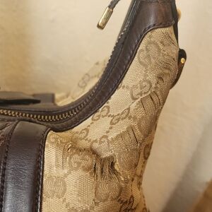 Authentic Gucci Brown Crocodile Trim Secret Medium Hobo features GG canvas, gorgeous dark brown crocodile and leather trim, gold tone hardware details, and beige canvas, with 3 interior pockets. Measures approx. 15" x 6" x 13.5" with a 5” handle drop. Bag does show signs of wear (snags throughout the canvas) as shown in photos. Still has a lot of life left. Retailed for $2,300.