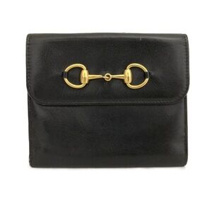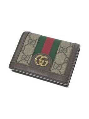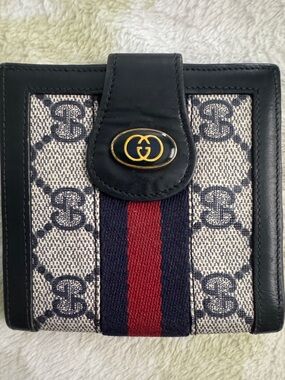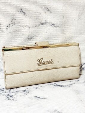 Gucci bifold wallet in beige GG canvas. Tan leather trim with contrast stitching. Gold double G logo hardware on front. Classic neutral styling.