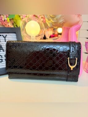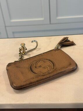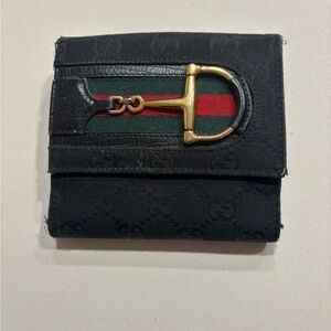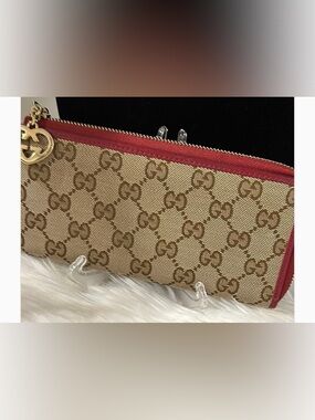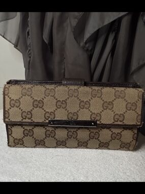Gucci Beige Canvas Wallet with Tan Leather Trim and Gold Logo