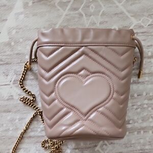 Elegant Gucci crossbody bag in beige chevron leather. Features a gold chain strap and signature GG emblem. Ideal for versatile styling.
