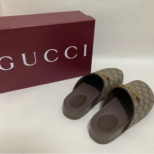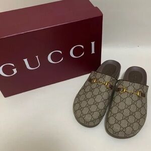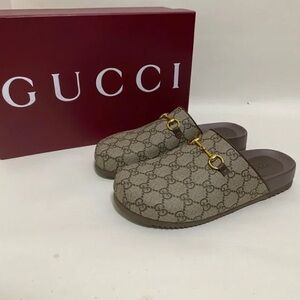 Elegant Gucci clogs with signature beige monogram. Features gold hardware and brown accents. Ideal for chic fashion.