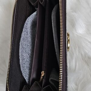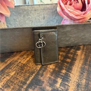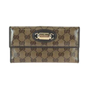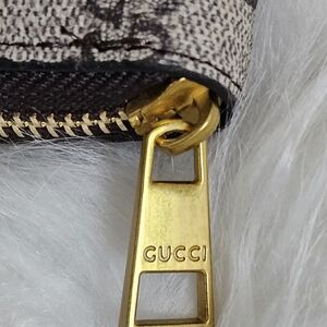 Chic Gucci wallet in beige canvas. Features iconic GG pattern. Gold-tone zipper adds elegance.